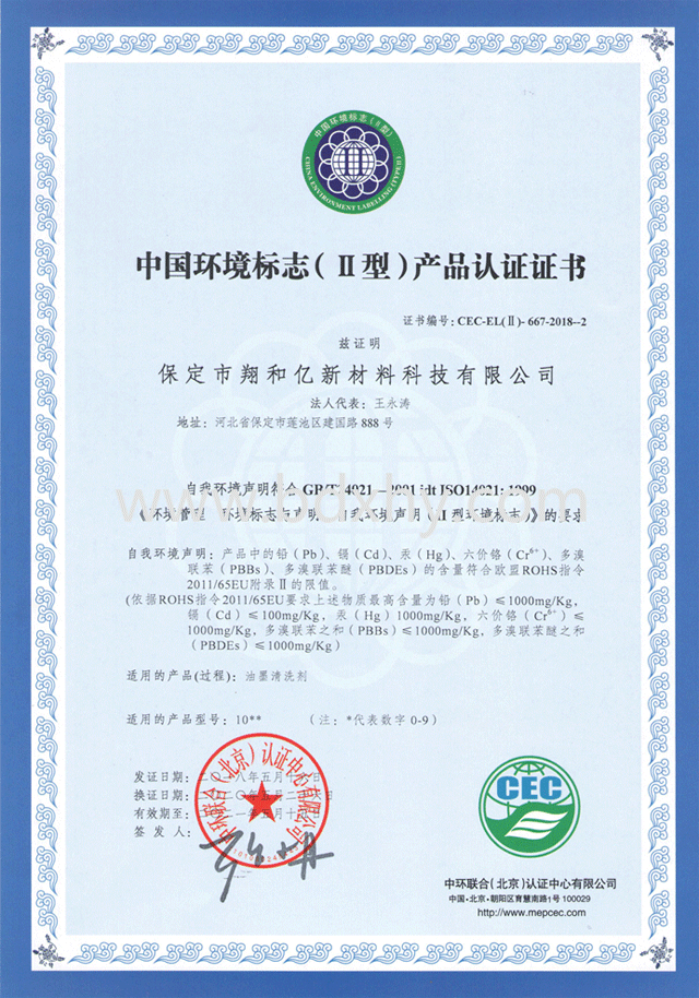 我公司于2018年5月通過中環(huán)聯(lián)合(北京)認(rèn)證中心對我公司嚴(yán)格審查,認(rèn)證通過并獲得《中國環(huán)境標(biāo)志(II型)產(chǎn)品認(rèn)證證書》—認(rèn)證產(chǎn)品名稱:潤版液,油墨清洗劑。